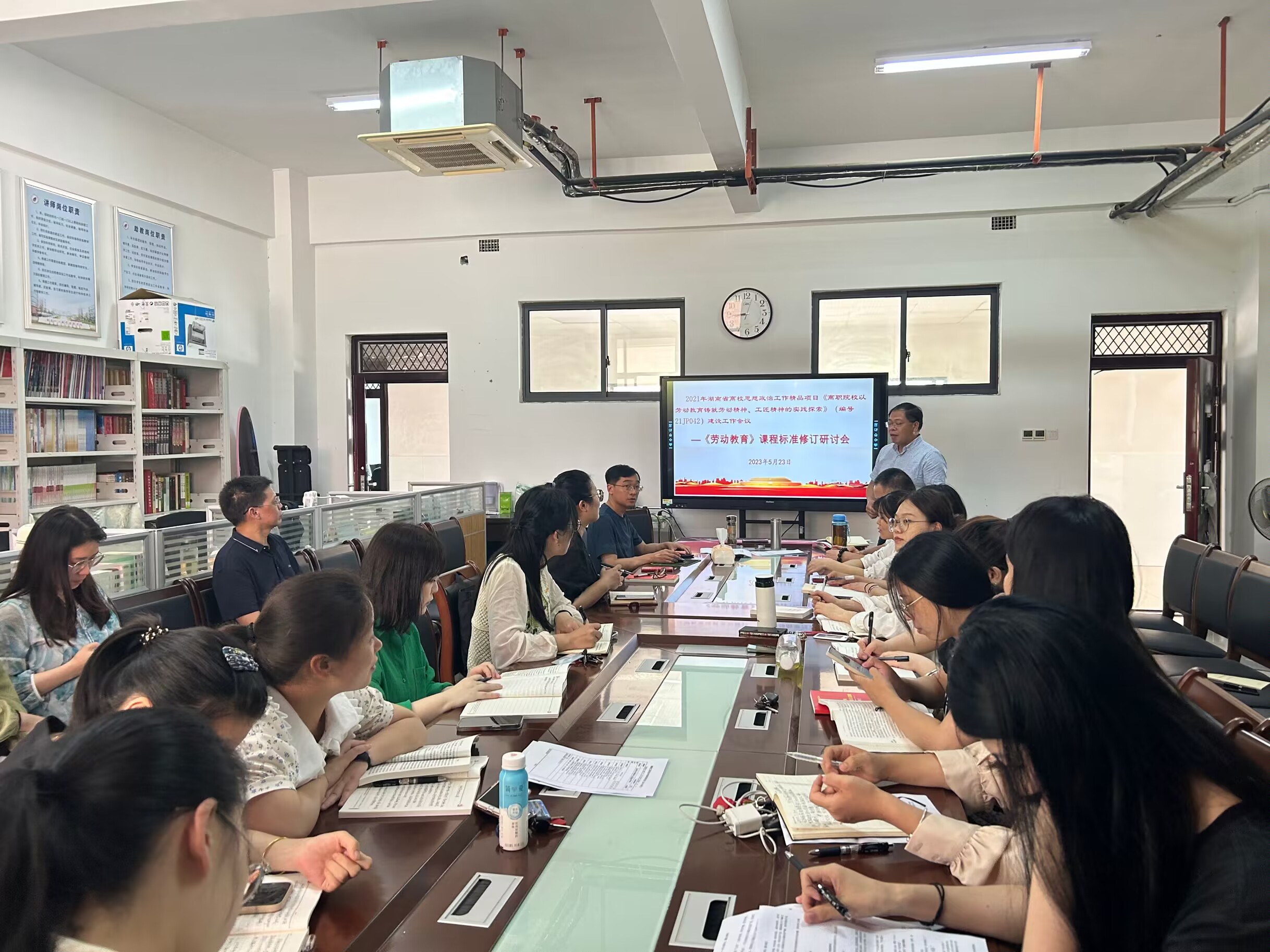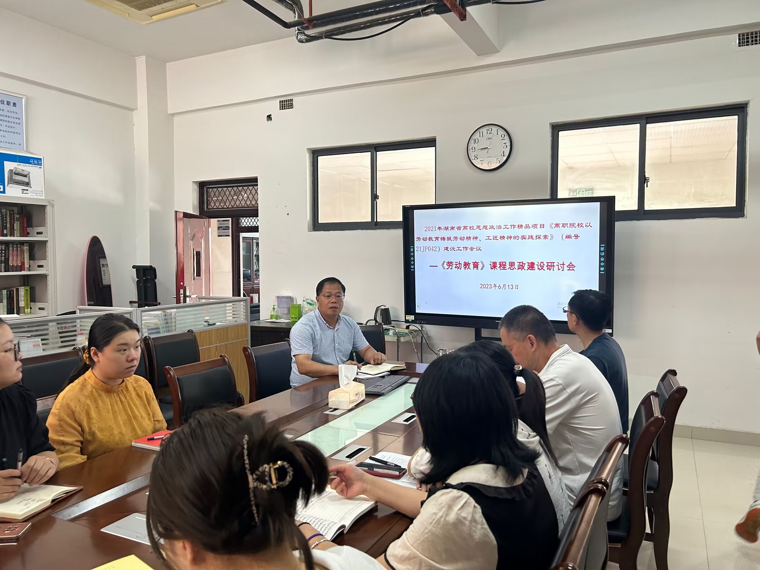 6月13日,马克思主义学院在励志楼110召开了高质量推进2021年湖南省高校思想政治工作精品项目《高职院校以劳动教育铸就劳动精神、工匠精神的实践探索》(编号21JP042)建设的工作会议。会议主题是:为全面落实立德树人根本任务,进一步推进《劳动教育》课程思政高质量建设?;嵋橛衫畲勘蠼淌谥鞒郑碓喝褰淌Σ位?。
