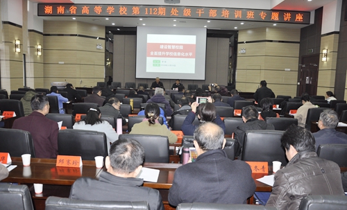 12月24日下午,长沙民政职业技术学院党委副书记、院长李斌教授来我校作题为“建设智慧校园,全面提升学校信息化水平”的专题讲座。湖南省高校第112期处级干部培训班学员认真聆听了讲座。校长王雄伟教授主持讲座。