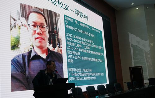 邓家明总工则是从化妆品的研发和生产方面谈了自己的经验和体会。邓工还向大家展示了自己公司研发的非常热销、客户订单最火的一款新产品——氨基酸洁面摩丝,并向大家介绍了其特殊成分、设计原理和市场情况,让在座的同学们接触到了洁面产品最前沿的信息和知识。同时,他也让同学们试用了他开发的部分产品并赠送给学弟学妹们使用。