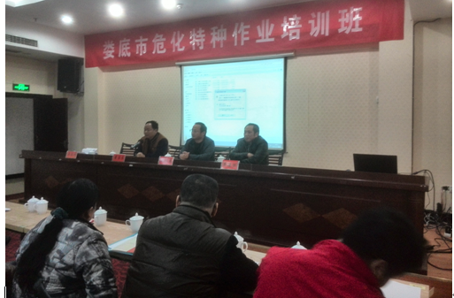 为进一步提高危化品行业从业人员的安全意识和业务水平,11月27日,应娄底市安监局邀请,湖南化工职院化学工程学院院长童孟良教授带领培训团队赴娄底市开展?;反右等嗽迸嘌担?/span>娄底市的5家涉及?;纷饕蹈谖徊僮魅嗽惫?0人参加了此次培训。