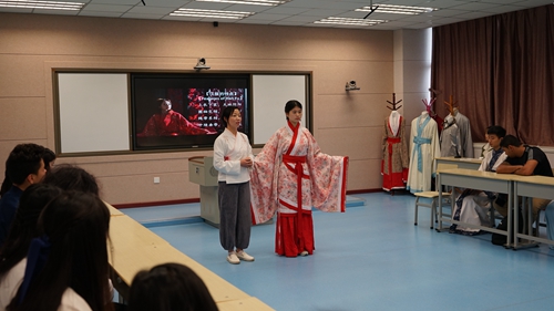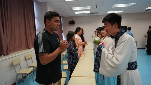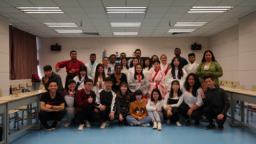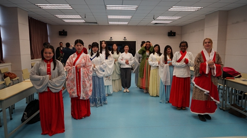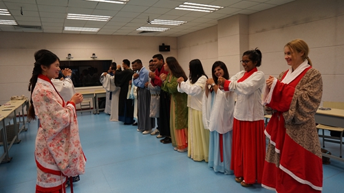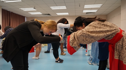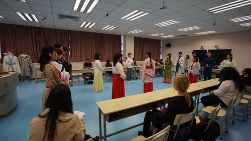 3月31日,新西兰凯特学院的师生走进湖南化工职业技术学院思政课堂,“零距离”体验中华优秀传统文化的魅力??翁谜瓜至酥泄贝笱奈幕孕?、文化认同、文化凝聚力,促进中新文化教育交流。图为新西兰凯特学院的师生身着汉服学习中华传统礼仪。 (耿星 摄影报道)