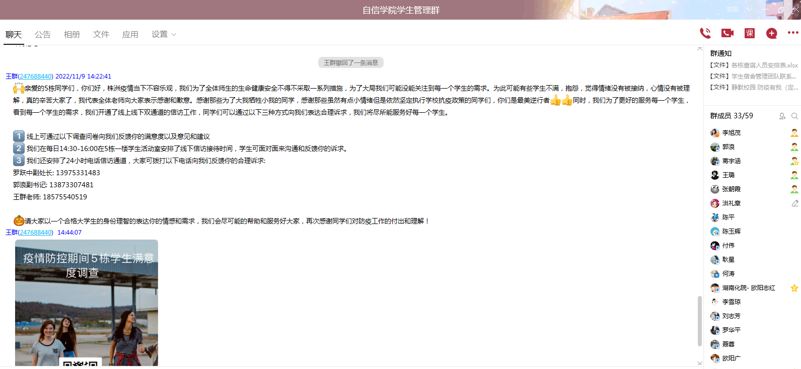 突然的静默管理让学生有些措手不及,也让学生的部分需求得不到满足,因而可能在情绪上得“小感冒”,从而影响身心健康。为了更好疏导学生情绪,也为了更好地服务每一个学生,自信学院开通了“线上+线下”的诉求通道。通过线上调查问卷征求学生对静默管理期间各项工作满意度、意见和建议等,线下安排了辅导员王群老师每天14:30-16:00在学生宿舍5栋一楼活动室接待学生,学生可面对面来沟通和反馈其诉求,同时还安排了24小时电话通道。
