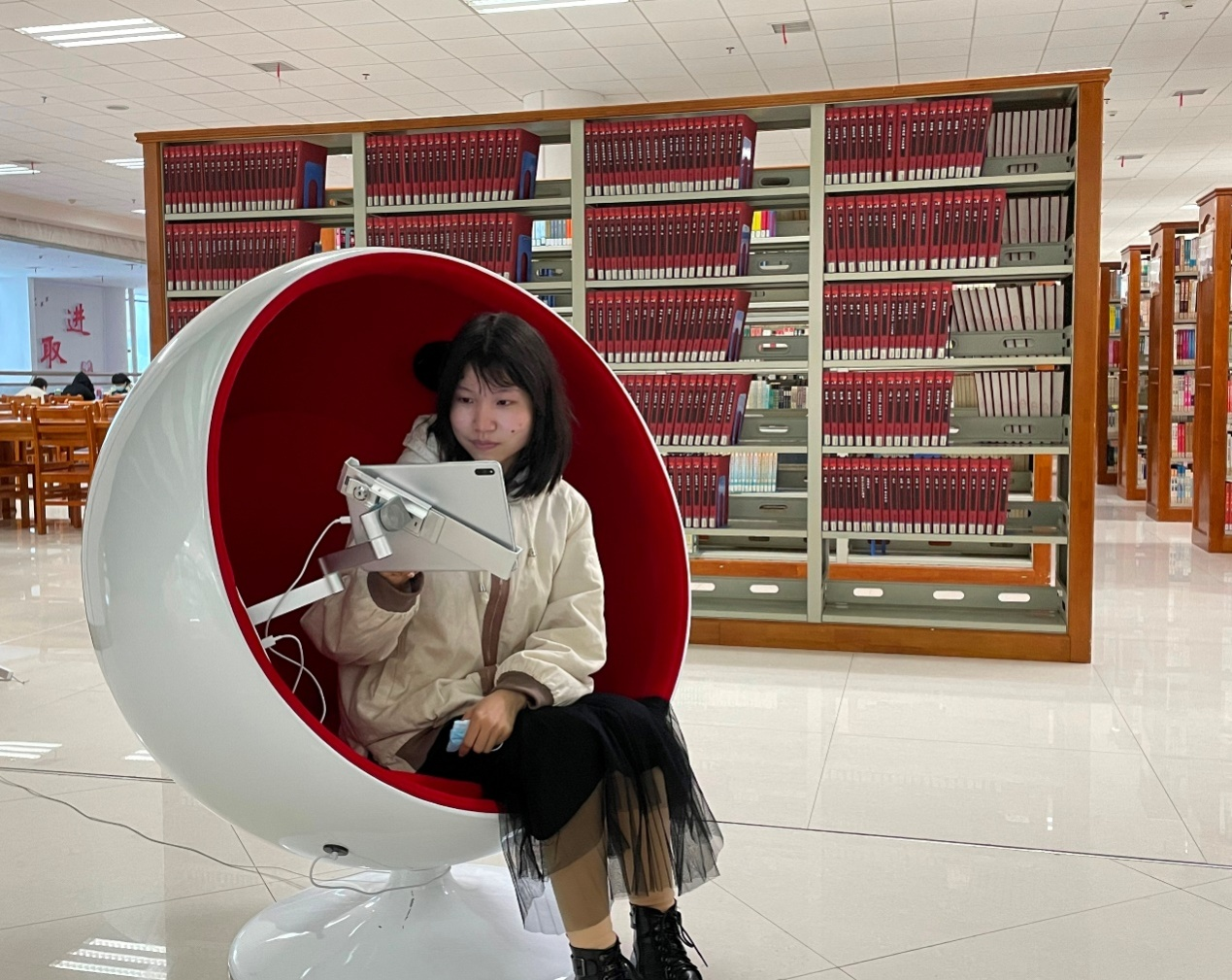 安静的图书馆里能“听书”吗?“有声阅读区”可以满足读者的“听书”需求。走进图书馆借阅大厅,一眼就能看到两台造型圆润的座椅,这是图书馆的智能化设备—有声太空舱。