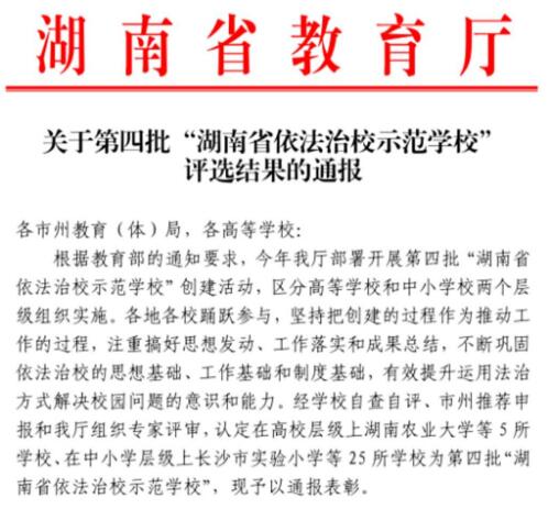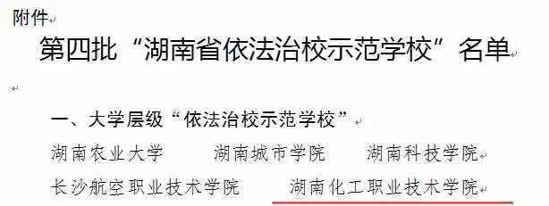 近日,湖南省教育厅下发了《关于第四批“湖南省依法治校示范学校”评选结果的通报》,我校被评选认定为“湖南省依法治校示范学校”, 此次共5所高等学校入选,其中高职院校仅2所。
