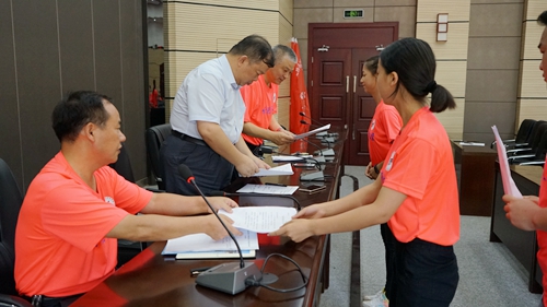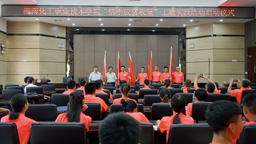 会上,由5个二级学院组成的5个实践活动小组分别派代表向学校党委书记、校长递交承诺书;党委书记、校长依次向各实践活动小组授旗,小组带队老师上台接旗。