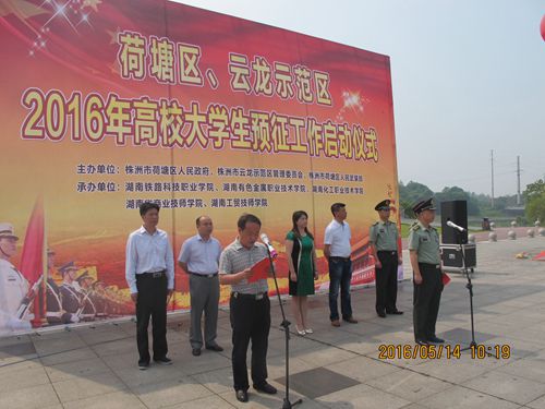 5月14日上午10时,由荷塘区人民政府、云龙示范区管委会、荷塘区人武部主办和湖南化工职业技术学院、湖南铁路科技职业技术学院、湖南有色金属职业技术学院、湖南商业技师学院、湖南工贸技师学院等5所高校联合承办的“2016年高校大学生预征工作启动仪式”在职教城中心广场举行。启动仪式隆重而热烈,各级领导和五所高校师生共1000余人参加。我院副校长王为、武装部长汪发亮和五名辅导员老师代表及200余名有志参军入伍的青年学子参加。
