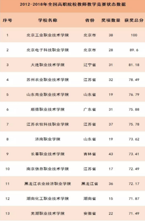 日前,中国高等教育学会发布了“全国高校教师教学竞赛分析报告(2012-2018)”,该报告对全国高校教师教学竞赛情况做出分析及数据排行,湖南化工职业技术学院表现耀眼,在全国高职院校排名第12名,湖南省高职院校排名第1名。