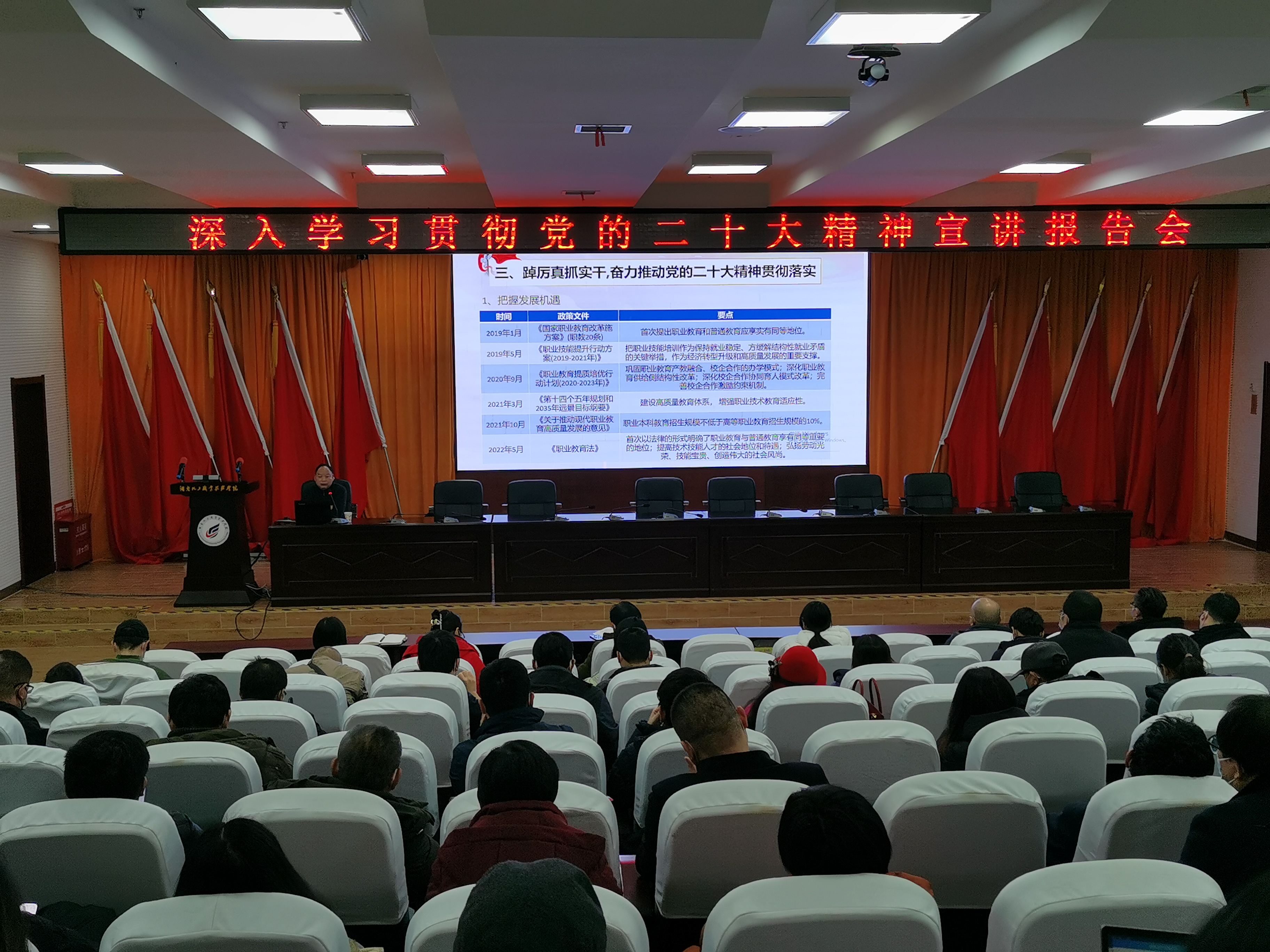 童孟良紧紧围绕“深入学习贯彻党的二十大精神 推动学校高质量发展”这一主题,深刻阐述了党的二十大的重大意义、思想内涵、使命任务、战略部署,生动讲述在党的二十大精神指引下切实担当职业教育的责任与使命,奋力推动党的二十大精神贯彻落实,争做堪当民族复兴重任的为学为事为人的“大先生”决心。