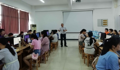7月24日上午十点,正是烈日炎炎似火烧的时候,校长王雄伟教授顶着烈日,来到公教楼514教室,看望在此参加2018年湖南省中职英语骨干教师培训的全体学员。