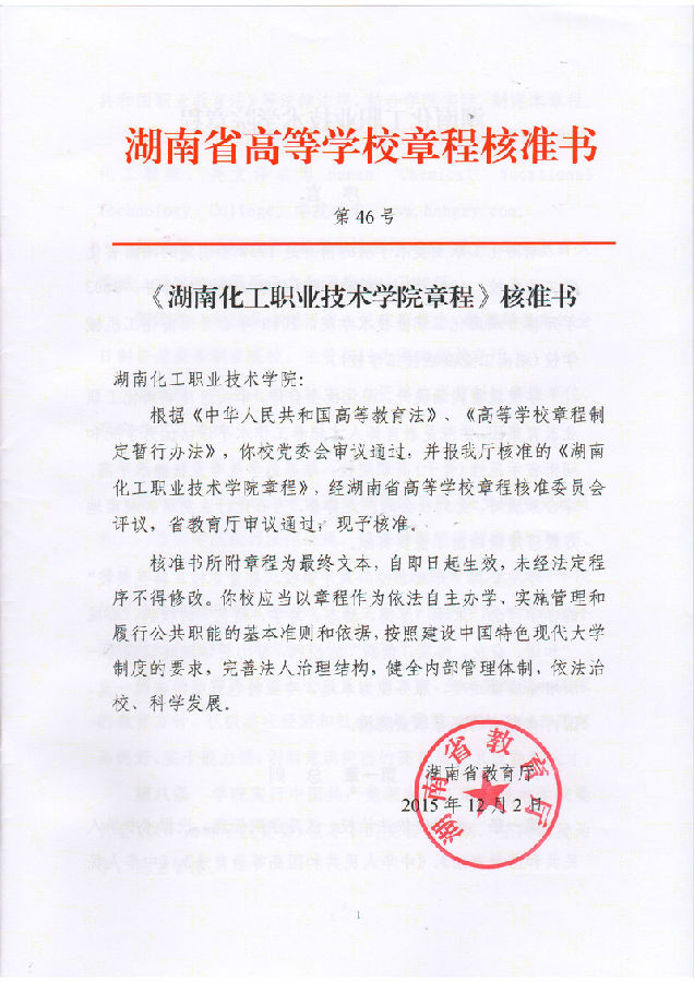 《湖南化工职业技术学院章程》通过省教育厅核准