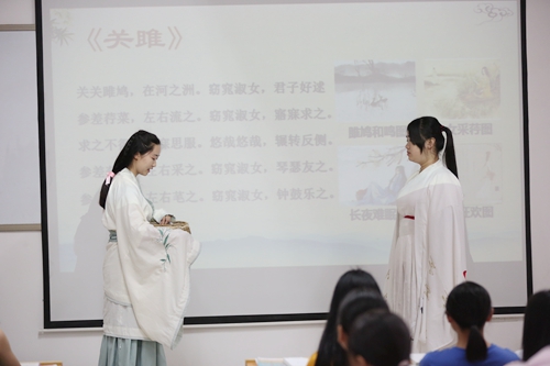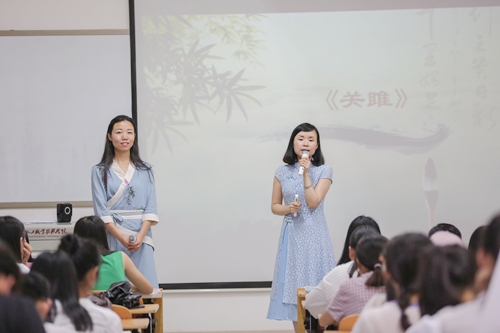 在这次主题为“以文化自信串起传统文化珍珠”的思政课上,两位老师以互相采访的方式,上半场从《诗经?关雎》谈起,师生一起感受《诗经》的语言之美、道德之美、生命之美,体味“淑女君子”内外兼修的中华风度。下半场则以上合组织青岛峰会为案例,师生共同沉浸于对中华民族“有朋自远方来”博大胸怀的自豪感,并自信于儒家“和合”思想对中国和世界的深远影响力。两位老师一问一答,一唱一和,幽默新颖的方式也激发了学生们课堂参与的热情,有的展示书法作品,有的发起灯谜有奖竞猜,有的即兴唱起湖南花鼓戏,将课堂教学一次次推向高潮。
