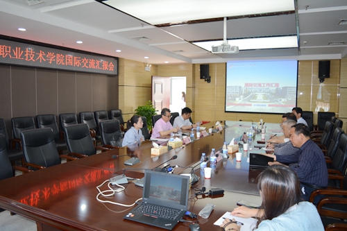 5月8日上午,省教育厅国际交流处周芳友处长、职成所舒底清副所长及国际交流处刘颖科长一行三人来到我校,对我校留学生招生条件进行了实地考察,他们考察了教室、实训工厂、学生食堂、学生宿舍,在行政楼三楼会议室听取了党委副书记刘毅作的我校国际交流工作汇报。校党委书记刘望、校长王雄伟出席会议并发言,党政办、教务处、学生处、后勤处、保卫处、国际交流处等部门负责人参加了会议。副校长王为主持汇报会。