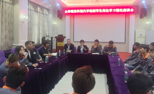 会上,公司总经理特助李树萍介绍了学生在企业的学习情况和学习进度,并表示,学生在岗位学习能力强、积极性高,他们的到来为企业增添了新的活力。现代学徒制班的19名学生畅谈了在公司的学习生活情况,学生们纷纷表示公司安排的师傅不但专业知识渊博、技能精湛,而且平易近人,对他们指导细致入微,让他们感受到了公司的优秀企业文化,并且学到了很多企业一线的专业知识和操作技能,收获很大。公司的师傅代表对学生们的表现给予了充分肯定并提出下一阶段工作安排的建议与要求。陈杰山对企业表示了衷心的感谢,要求学生明确双重身份(学生和准员工),保持积极向上的精神面貌。公司总经理陈科阳表示,目前水性涂料行业发展前景广阔,公司未来的发展需要大量技术技能型人才,鼓励大家扎下根、沉下心,学好专业知识、苦练专业技能,为自己的职业生涯发展打下良好的基础。