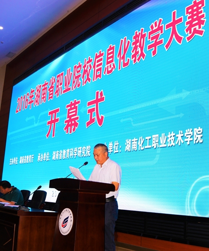 应若平副厅长代表省教育厅对各位选手披荆斩棘进入全省竞赛表示热烈祝贺,对省教科院职成处、湖南化院为大赛所做的精心准备表示衷心感谢。她动情地讲到,信息化教育是教师遇到的最美教育,当前互联网正在改变教育形态,信息化教学既是职业教育教学改革的突破口,也是职业教育人才培养改革的着力点。我们要以此次大赛为新的起点,以追求卓越、争创一流的精神将信息化教学改革引向深处。应若平在开幕式上作了题为《大力推进信息技术与教育教学深度融合》的讲话,并就信息化教学提出三点意见:一是要准确把握信息化教学的定位。信息化教学,简言之,就是利用现代信息技术改革传统的教学模式、学习方式,提高教学效率。因此,在准确把握信息化教学定位时,要清晰的认识到,信息化教学重在教学模式创新、重在破解教学难题、重在提高教学效益。当前部分学校、部分教师对信息化教学的重点、目标把握不准,导致效果不尽如人意,希望借助本次大赛,有效推进湖南省职业院校信息化教学再上台阶。二是要深入推进信息化教学改革。近年来,湖南职业教育信息化取得了显著成绩,在全国产生了深远影响,但总体而言,信息化教学改革还不够深入,效果还不够理想。下一步,要准确把握信息化教学改革的重点方向,即着力推进优质资源共建共享、着力推进学习方式创新、着力推进育人模式创新。真正形成“人人参与、人人共享”的资源建设新格局,充分激发学生学习的原动力,让学生由“要我学”变成“我要学”。三是要扎实办好本次大赛。2016年全省职业院校信息化教学大赛的参赛人数较2015年翻了一番,说明全省正在形成一股信息化教学改革的最高潮,大赛既是展示教师风采的舞台,更是教师切磋技艺的平台,因此一定要扎实办好本次大赛,确保组织要有序、结果要公平公正,要为参加全国信息化教学大赛做好充分准备。