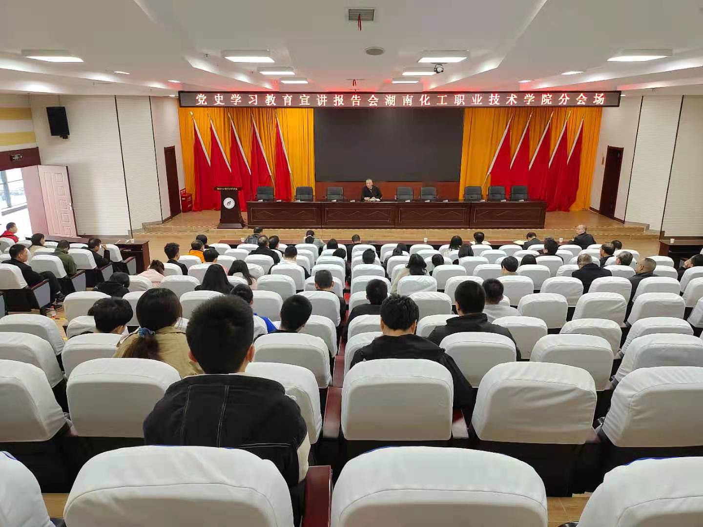 4月6日,学校组织师生参加省教育厅组织的“党史学习教育宣讲报告会”视频会议,会议分会场设立在图书馆二号报告厅。全体党委班子成员、二级院(部)党总支全体委员、全体党支部书记、部分优秀学生代表参加了本次会议?;嵋橛商匙槌稍薄⑹∥逃の笔榧峭踅ɑ鞒?。