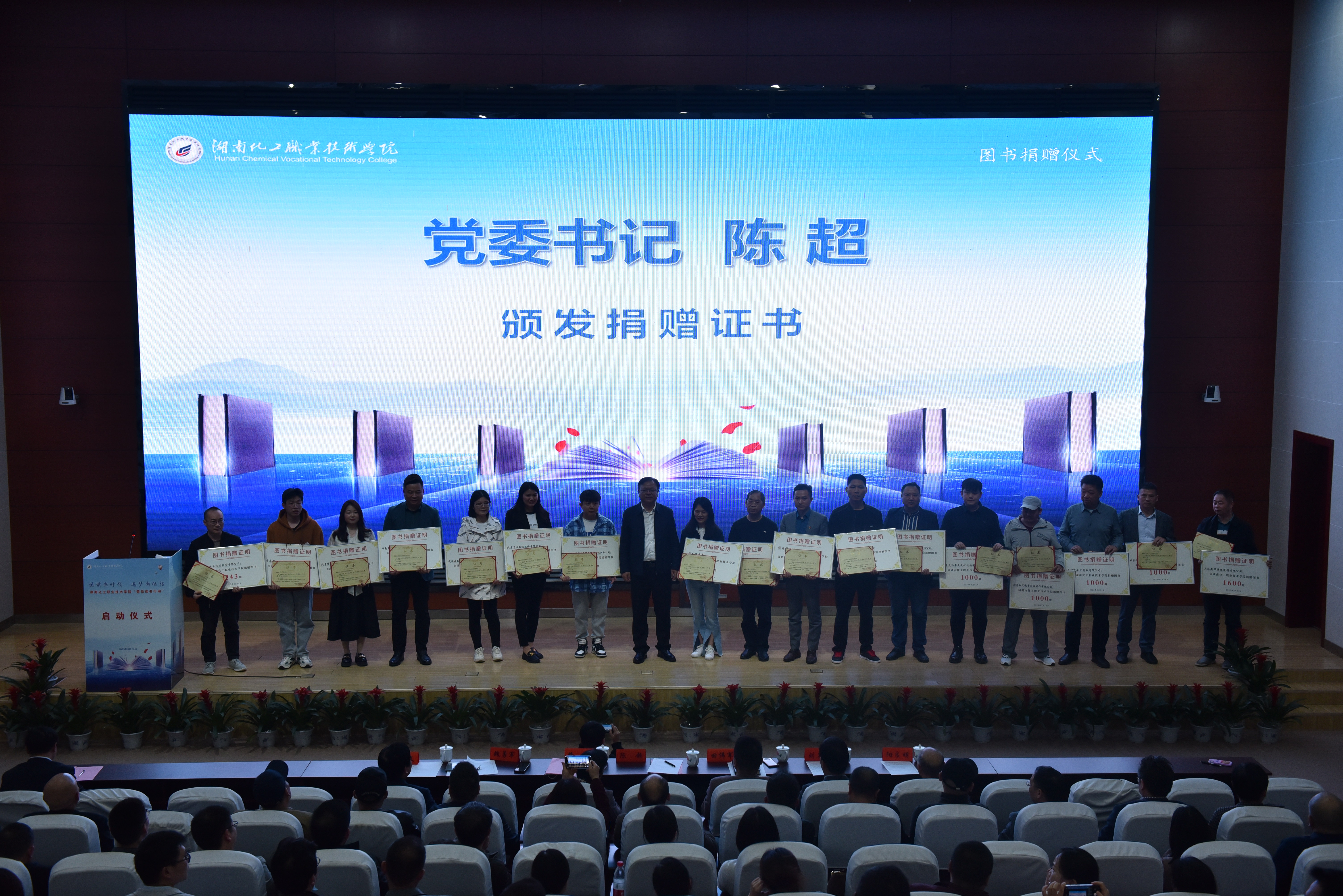 活动第二阶段是图书捐赠仪式。图书馆于2021年12月起开展“情系化院·共沐书香”图书捐赠活动,得到学院师生、社会各界人士及相关单位的积极响应。目前图书馆共收到捐赠图书3万4千余册。为进一步丰富图书馆藏,激发全体师生读书热情,助力我校创新实施“双高”计划,创建本科层次职业技术大学,经学校研究决定开展第二次图书捐赠活动。在图书捐赠仪式上,副校长田伟军宣读《湖南化工职业技术学院图书捐赠方案(第二批)》,隆平校长宣读企业、校友及师生图书捐赠名单。