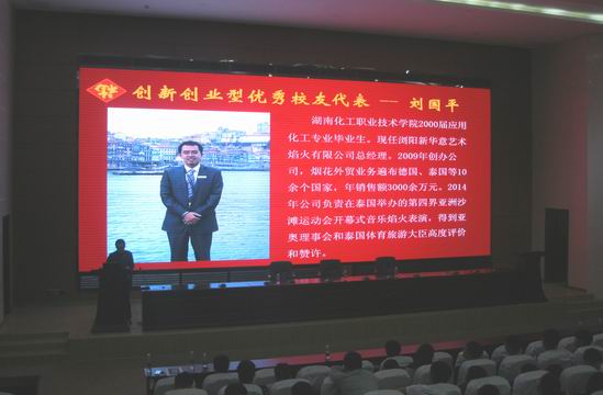 创新创业型优秀校友代表刘国平,是我院2000届应用化工专业毕业生。现任浏阳新华意艺术焰火有限公司总经理。2009年创办公司,烟花外贸业务遍布德国、泰国等10余个国家,年销售额3000万元以上。会上刘国平讲述了他由学习到创业的历程,有艰难险阻与风风雨雨,也有汗水凝聚的累累硕果。同时他号召学弟学妹们在“大众创业万众创新”的新时代,脚踏实地、真干实干,提高创新创业的能力和意识,做好创业的各项准备。