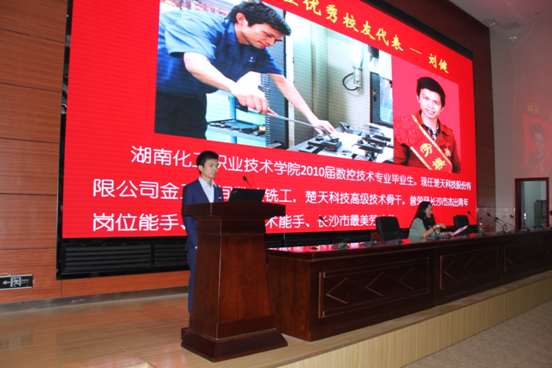 技术技能型优秀校友代表刘健,是我院2010届数控技术专业毕业生。现任楚天科技高级技术骨干,曾荣获长沙市杰出青年岗位能手、长沙市技术能手、长沙市最美劳动者、2014年长沙市劳动模范等荣誉称号?;嵘?,刘健向学弟学妹们介绍了他在母校与企业学习成长的经历,8年时间,他由初入大学的懵懂少年蜕变成掌握扎实技术根底满怀理想的毕业生,又由大学毕业生成长为长沙市劳动模范。短短数年间他参与公司10多项新产品试制,攻克了15项技术难关,配合完善了9种生产工艺,提出技术革新和合理化建议60多项,独创6项新加工方法,成为了新一代产业工人的优秀代表。这些源于学习上孜孜以求,工作上爱岗敬业,技术上刻苦钻研、精益求精,勇于创新。