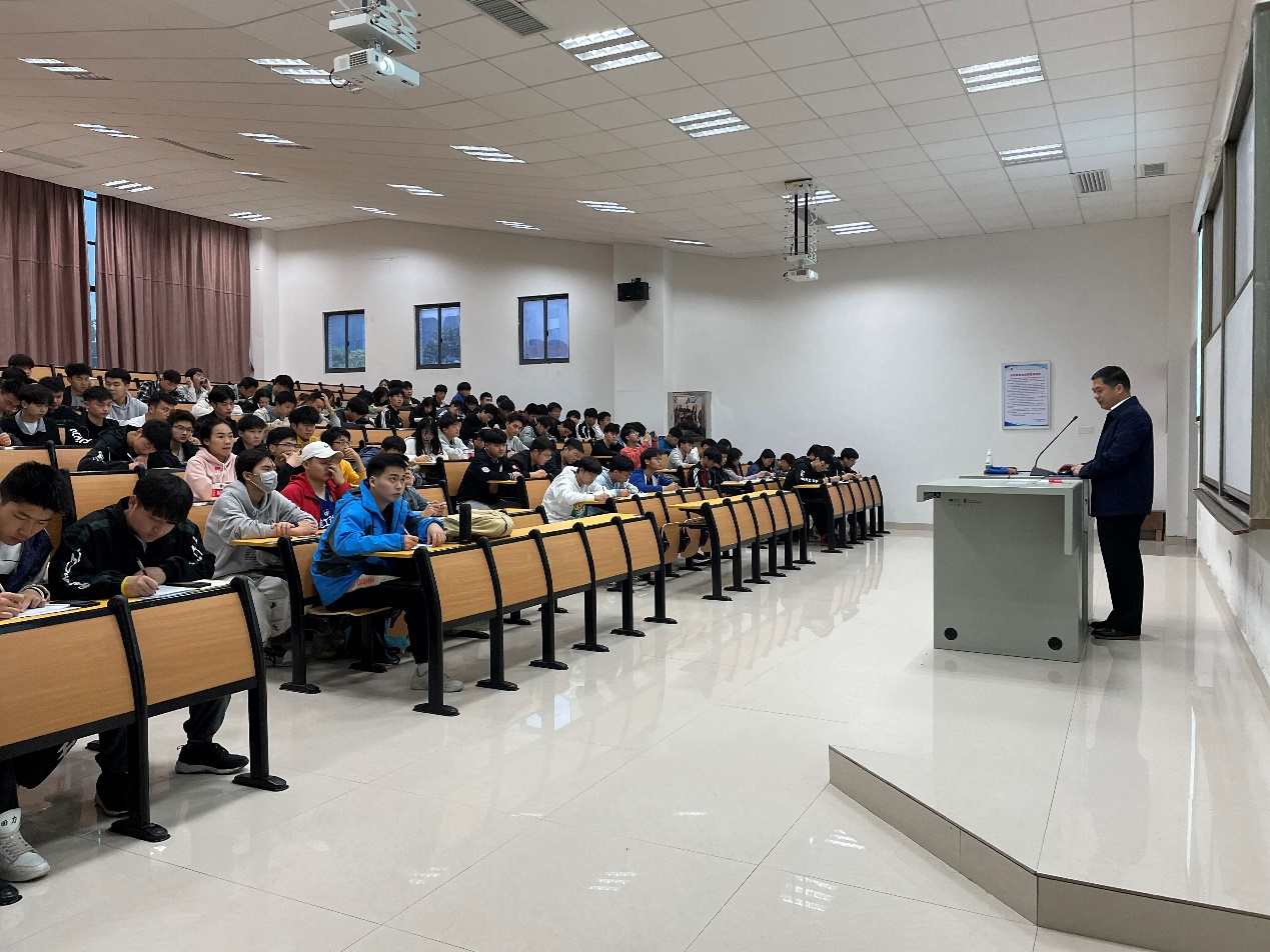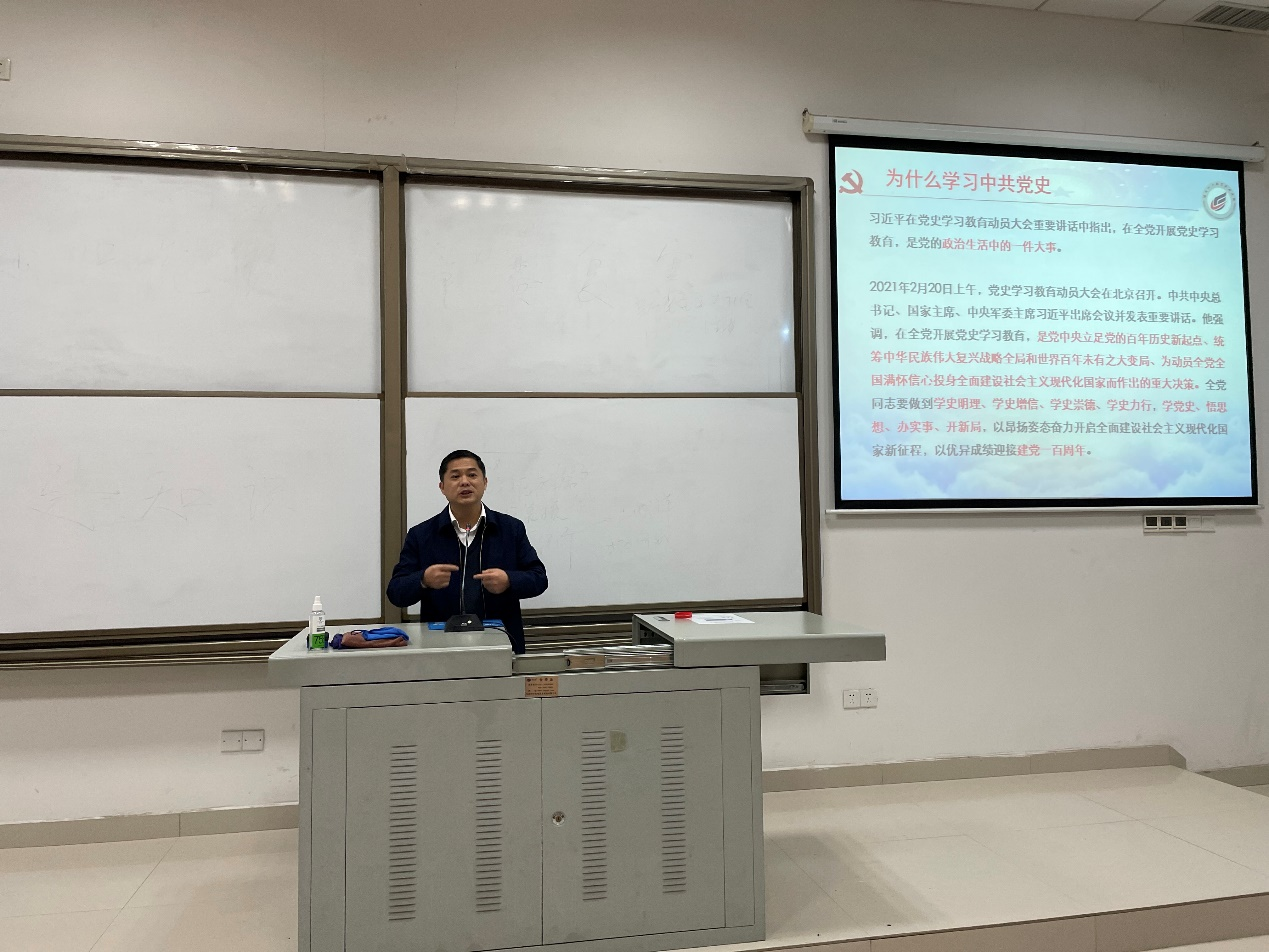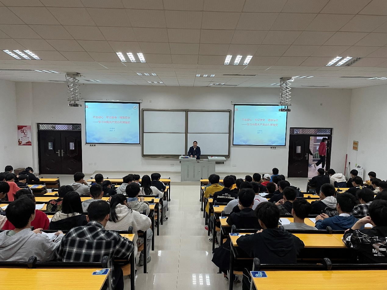 4月28日晚,纪委书记肖耀南在励志楼222教室以“不忘初心 牢记使命 增强信念——学习中国共产党百年辉煌史”为主题给机电工程学院第十一期入党积极分子培训班的128名学员讲党课。