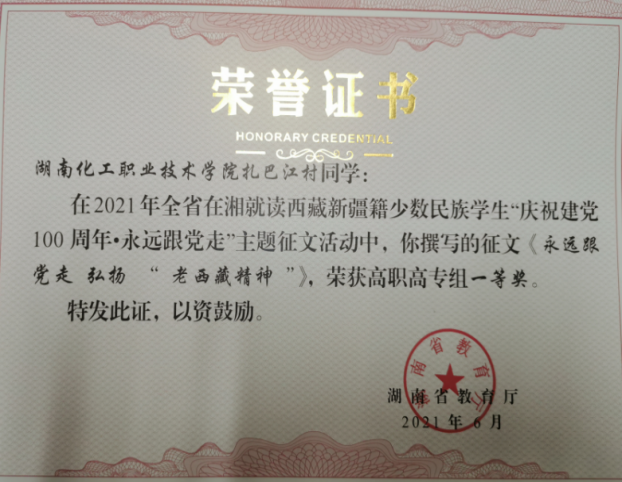 中华一家亲,同心共圆中国梦。为了坚定少数民族学生感党恩、听党话、跟党走的信心决心,铸牢中华民族共同体意识,把爱我中华的种子埋入每个学生心灵深处。学院组织西藏籍学生积极参与湖南省教育厅组织开展的2021年在湘就读西藏新疆籍少数民族学生“庆祝建党100周年?永远跟党走”主题征文活动,在老师的精心指导下,学院藏籍学生立足家乡发展变化,结合自己所学专业,认真撰写主题征文,他们纷纷承诺要当爱党爱国的忠诚守护者,争当民族团结的忠实践行者,立志为建设祖国、稳固边疆作出更大的贡献。
