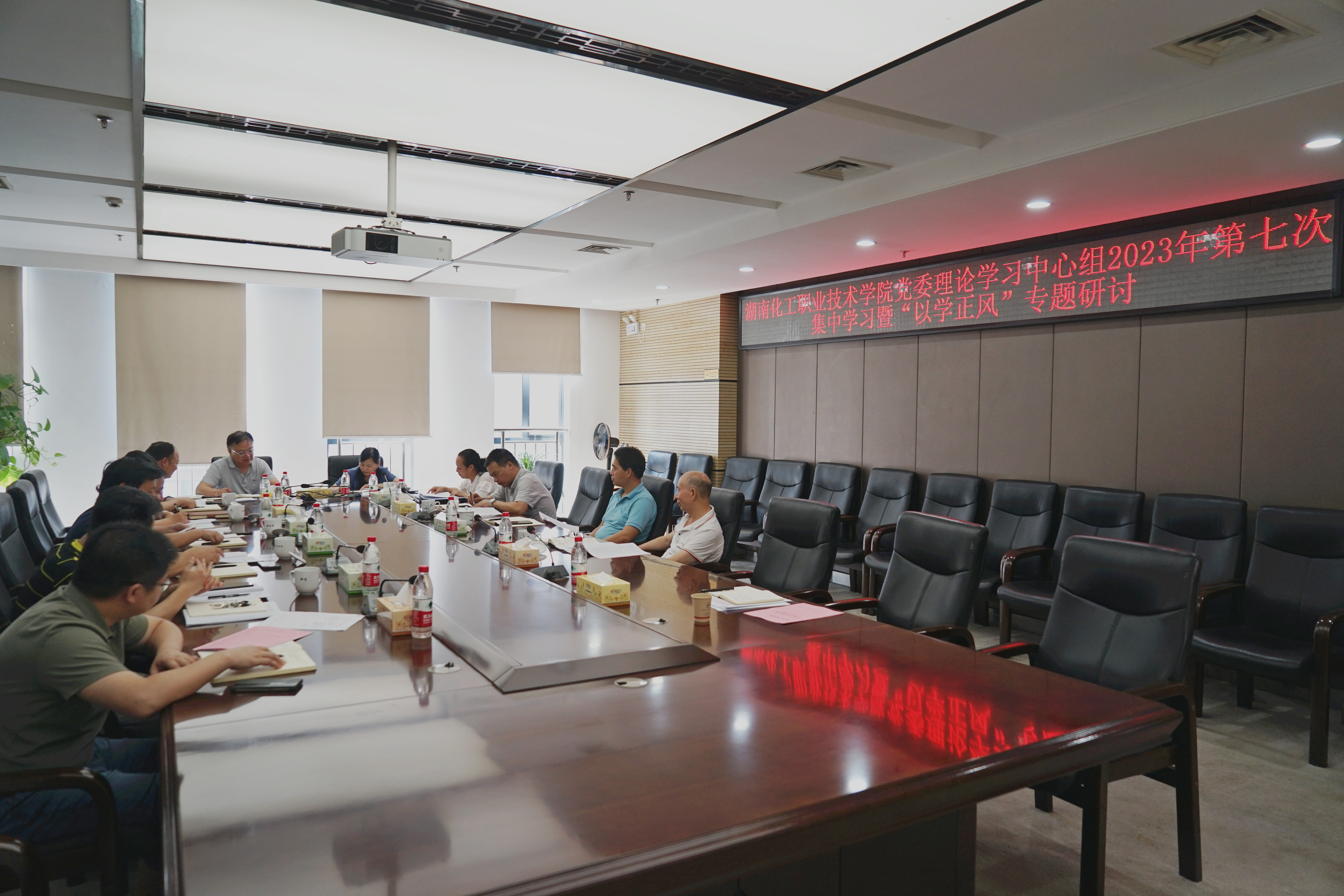 7月3日,湖南化工职业技术学院党委理论学习中心组在行政楼三楼会议室举行2023年第七次集中学习暨“以学正风”专题研讨。学校全体党委委员参加学习会,党委书记陈超主持学习会并讲话。