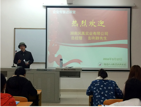 今天走进我们课堂的企业专家是湖南凤凰实业有限公司总经理彭利群先生??纬讨魈馐恰洞判圆牧铣隹谛∽橹啡现统隹谝滴褚恪?,彭总详细介绍了本次商外1411下企业认知实训的产品磁性材料,他从磁性材料的种类,性能,生产工艺等方面做了详尽的介绍,并对如何在外贸工作中寻找磁性材料的客户,如何跟进等内容毫无保留的和学生做了讲解。讲座持续了两个多小时,师生反响热烈。通过这次课,学生对企业和产品有了一个较全面的了解,并就外贸工作可能遇到的问题与彭总进行了积极探讨。现场气氛热烈、互动亲切,同学们纷纷表示获益良多。