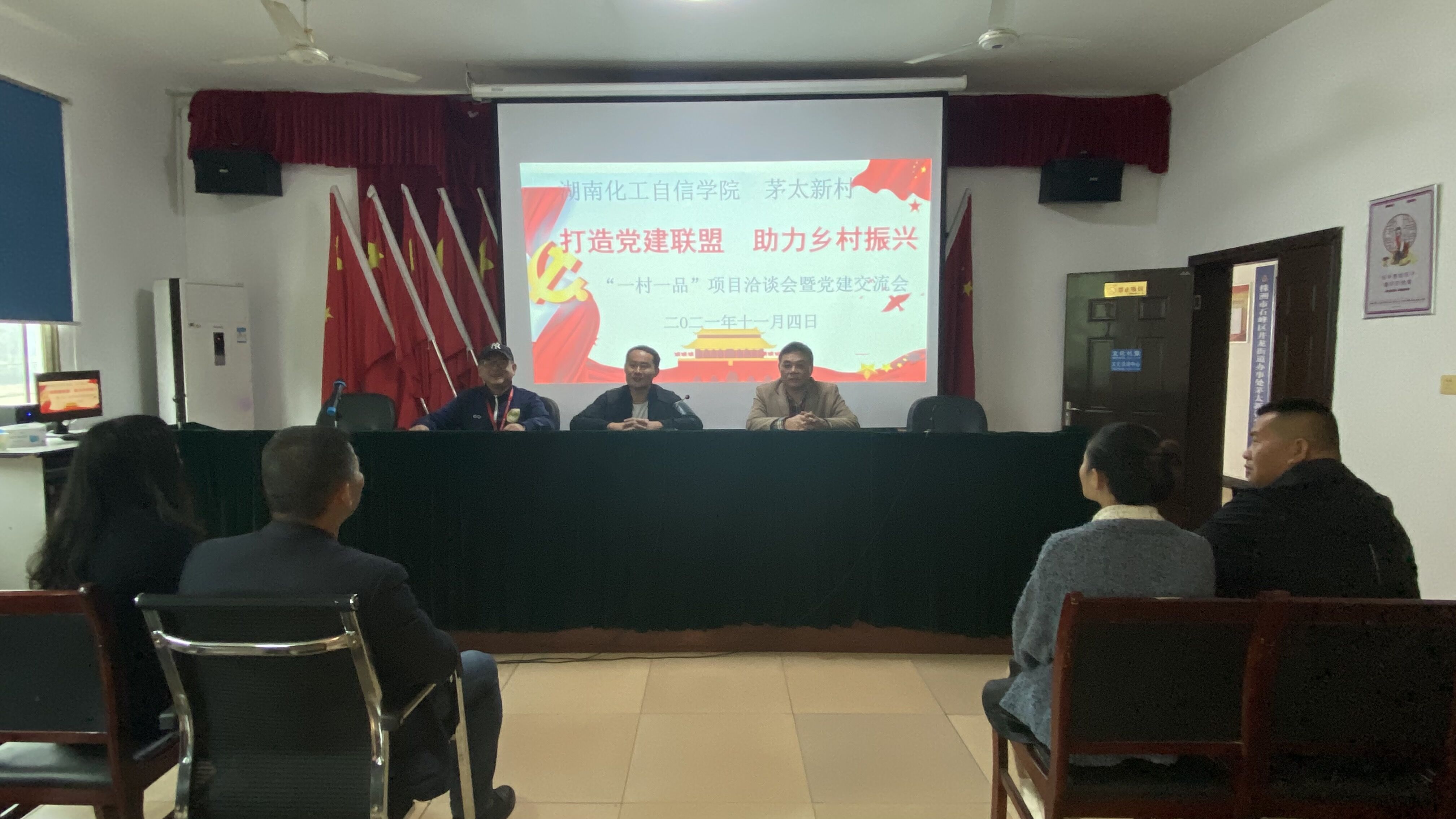 11月4日,项目洽谈会暨党建交流会在茅太新村村委举行。自信学院院长欧阳广、党总支书记许建平、副书记郭浪和茅太新村党总支书记张章、副书记言细妹等参加了会议。