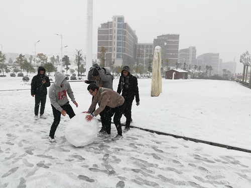 上午10点以后,校园里渐渐热闹起来,同学们陆续走出寝室,到宿舍门前、校园里面滚雪球、堆雪人、打雪仗、拍雪景。说到滚雪球,北方来的学生显然比南方的学生更加熟练,在二食堂前面写着“无畏”的石碑前面,一名山西来的学生在滚雪球,我问他:“滚这么大雪球用了多长时间?”他回答说:“就一会功夫,我们那儿经常下雪,小雪也有这么大,滚雪球不算啥?!?栋宿舍门前,已经堆起了两个可爱的雪人。