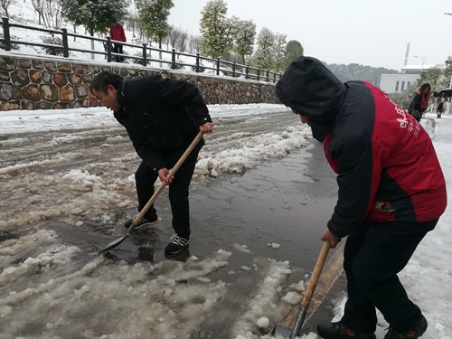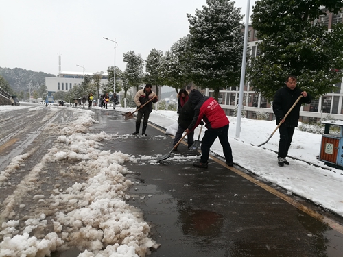 下午,雪还在下,天气越发寒冷??吹浇ソケ谎└哺堑牡缆?,很是担心雪后结冰,道路变滑将影响学生出行,学工部(处)通知各二级学院和宿管员动员学生干部、楼栋长和志愿者铲雪,却苦于没有铲雪的工具。跟后勤处罗桂甫处长打了一通电话后,有些安心了,罗处长表示已经安排好了,下午两点多后勤处会有人带工具来铲雪。从三栋值班室走出来后,果然就见后勤处罗处长正带领后勤人员紧急行动,在校园主干道撒盐扫雪清道。各二级学院和宿管员们也积极动员学生干部,楼栋长和学生志愿者在清扫各楼栋门前道路。七栋机电学院学生党员和学生会干部率先在七栋前坪义务铲雪,巳经铲出一条路。方便同学们出行,紧接着,一栋学生会干部及党员也在大门口铲雪清道,很快,二栋门前也已经清理出一条道路 ,三栋宿管员带着学生不多时也清扫出一条道来。银白世界里,纵横交错间,几条道路开始相通了,为师生出行提供了方便。