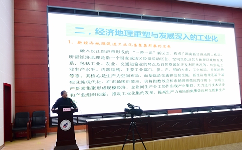 湖南师范大学经济学教授,博士生导师,湖南师范大学经济学研究所所长,湖南省经济学学会理事长,中国经济发展研究会常务理事,湖南省院士专家咨询委员会首届委员,湖南省政府“十三五”规划专家委员会委员,湖南省委重大决策咨询智囊团专家刘茂松以《湖南发挥“一带一部”优势融入长江经济带的战略思路》为题,从发挥“一带一部”优势的重大意义、经济地理重塑与发展深入的工业化、湖南深入推进工业化的对策创新三个层面讲述湖南着力发挥 “一带一部”区位优势,加快形成结构合理、方式优化、区域协调、城乡一体的发展新格局是实现经济、科教、文化、生态、开放五个强省,建设富饶美丽幸福新湖南的重大战略举措。