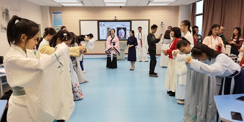 10月24日下午,思政课部教师李菡和基础课部教师邓滢在公教楼407教室共同为来自泰国北部农业职教中心的老师和学生们上了一堂别开生面的中华传统文化课。教学内容以“穿越时空之旅”为主题,在说汉字、品诗文、穿汉服、习礼仪、赏茶艺等特色活动中,两位教师带领泰国师生一起体验中国古代日常生活,感受中华传统文化的独特魅力。