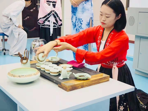 课堂的第二部分在“猜场景”活动中展开。两位教师模仿古人的见面及会客礼,泰国师生们在猜场景中见识了中国传统礼仪。接着,学生为客人们展示了一场赏心悦目的茶艺表演,并端上香茶和传统美食让客人们品尝,同时献上一曲轻盈优美的古典舞,让他们亲身体验到礼仪之邦的待客之道。最后,泰国师生们共同学习了几个特色舞蹈动作和简单传统礼仪。