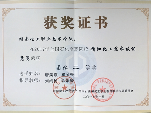 10月25日,2017年全国化工类职业院校技能竞赛精细化工技术赛项在南京科技职业学院落下帷幕。我?;Чこ萄г号沙鲇闪鹾杲淌诹於樱泼老?、瞿金香同学参赛,刘绚艳、佘媛媛等老师指导的参赛团队参加本次比赛,荣获团体二等奖,并获个人一等奖1项、二等奖1项、三等奖2项。