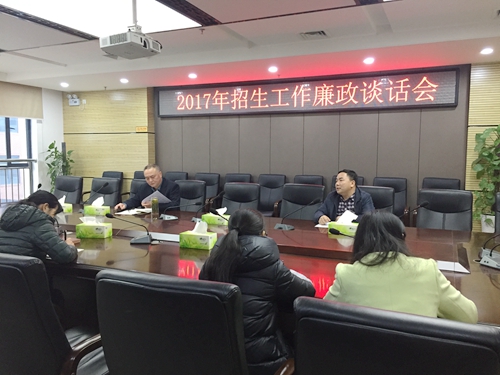 今年是学校招生工作改革年,为确保2017年招生特别是近期单招工作公正、公平、有序、顺畅进行,学校纪委近日分别组织教务处、招生就业处中层干部进行了集体廉政谈话。谈话会由纪委副书记虞三顺同志主持,分管教学工作的副校长隆平和分管招生工作的副校长王为分别参加了谈话会。纪委书记游大庆同志在会上发言。