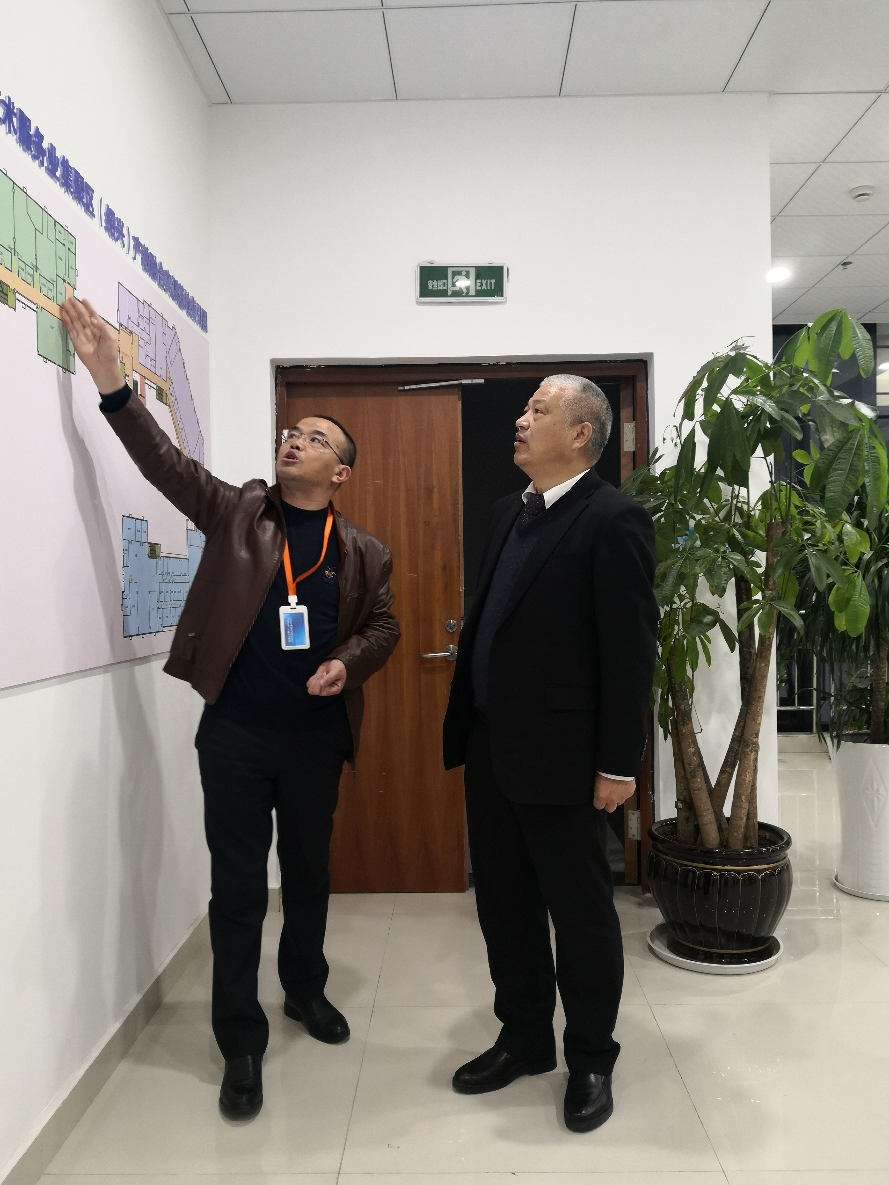图为夏志勇董事长为王雄伟校长介绍该公司基本情况