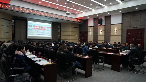 学习会采取中心发言、讨论发言和学习总结相结合的方式进行。党委副书记、校长王雄伟领学习近平总书记在二0一九年春节团拜会上的重要讲话精神和习近平总书记在省部级主要领导干部坚持底线思维着力防范化解重大风险专题研讨班开班式上的重要讲话精神;党委副书记刘毅领学习近平总书记在中共中央政治局第十二次集体学习时的重要讲话精神:推动媒体融合向纵深发展,巩固全党全国人民共同思想基??;副校长、工会主席易卫国领学习近平总书记在中央全面依法治国委员会第一次会议上的重要讲话精神:加强党对全面依法治国的领导;副校长隆平领学国务院关于印发国家职业教育改革实施方案的通知。与会人员围绕学习内容,紧密结合思想和工作实际,谈认识、谈体会,相继作了交流发言。