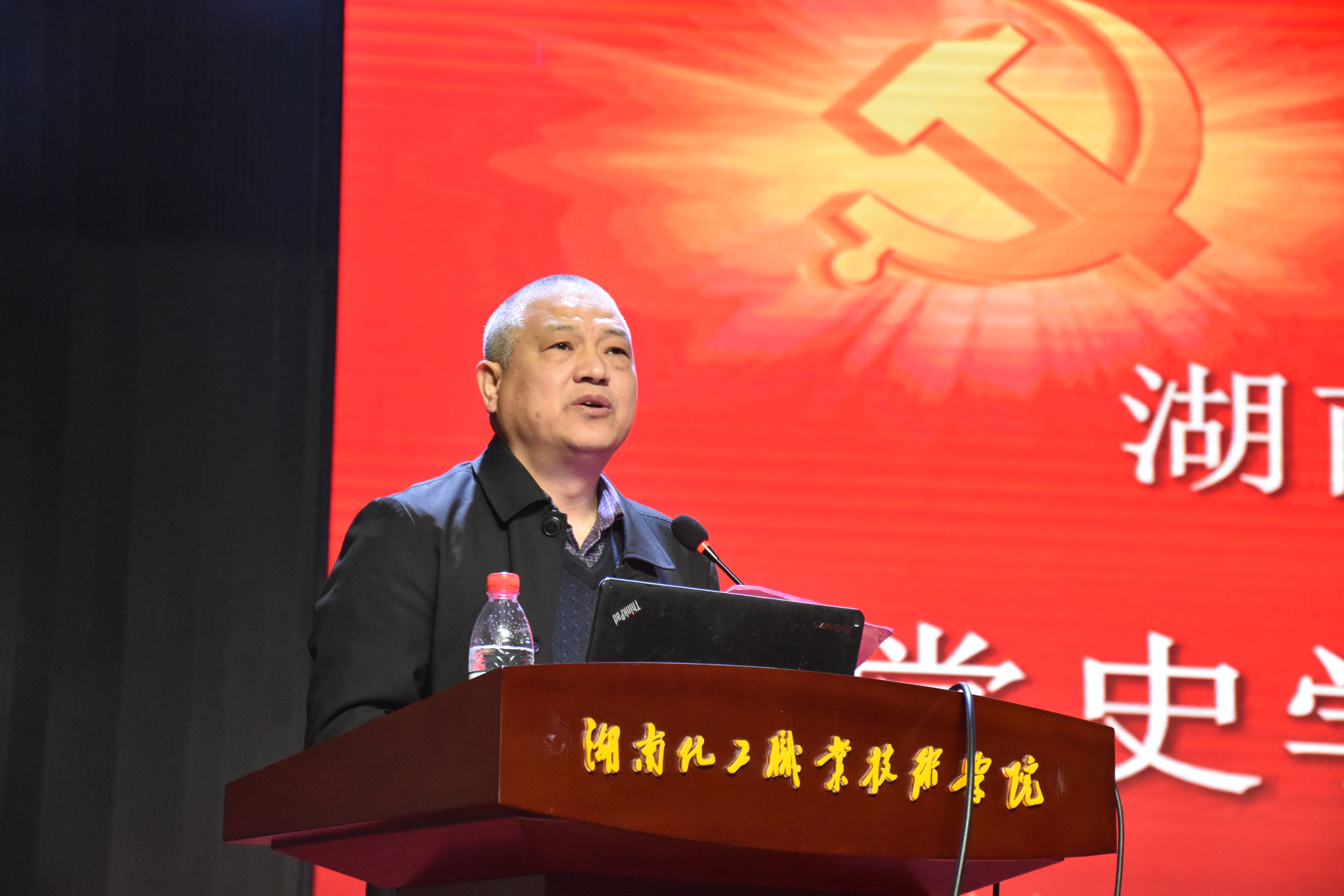 报告会宣讲人为市委宣讲团成员、学校马克思主义学院党总支书记李纯斌教授,他的报告深入浅出地指出了党史学习教育的总要求和目的,并从四个方面进行了精彩的阐述:一是要深入学习领会习近平总书记关于党的历史的重要论述,切实增强开展党史学习教育的政治自觉和行动自觉;二是要认真研读党史基本著作,全面了解中国共产党百年奋斗的光辉历程和历史贡献;三是要把百年党史与湖南巨变、株洲巨变联系起来把握,深刻感悟百年党史株洲篇章的作为与担当;四是要深刻把握党史学习教育的重点要点,不断从党的光辉历史中汲取砥砺奋进的智慧和力量。
