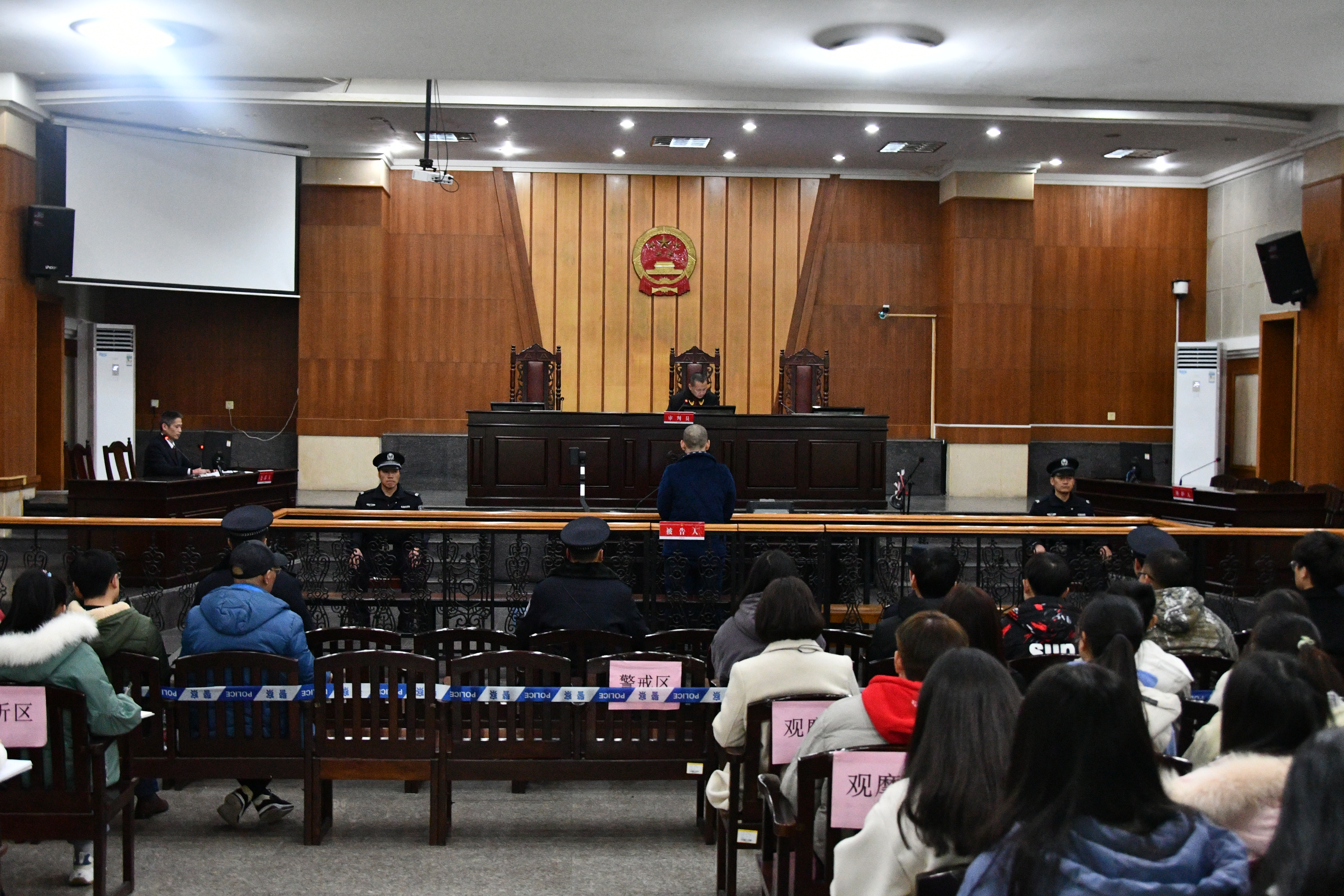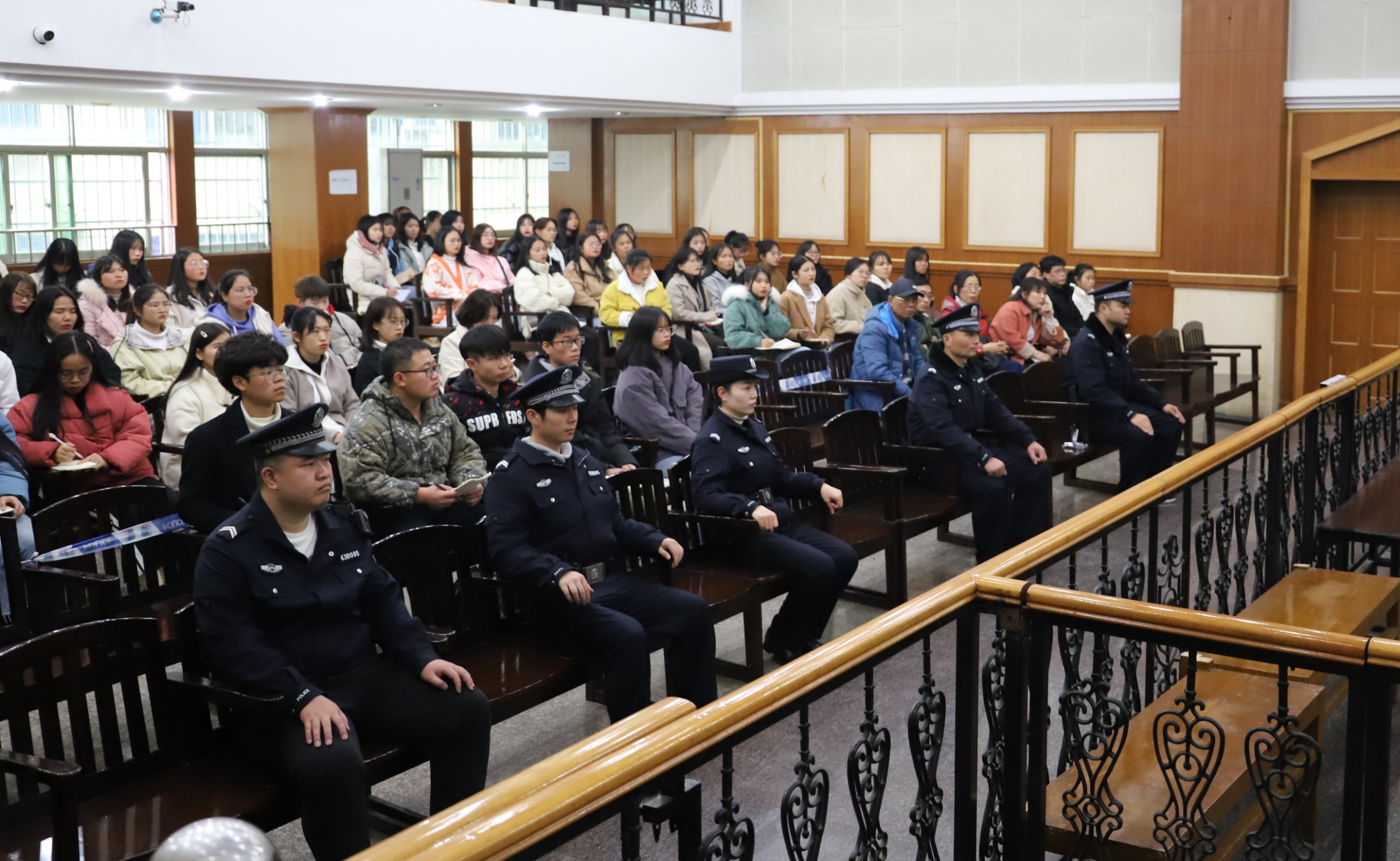 庄严的刑事审判庭座无虚席。在思政课教师和法庭工作人员的引导下,同学们先后旁听了一起盗窃案和妨碍公务案。盗窃案的犯罪嫌疑人系累犯,盗窃4卷价值1560元的电线,贩卖违法所得320元;妨碍公务案的犯罪嫌疑人因醉酒阻碍交通袭警。经过法庭调查、法庭辩论和当事人最后陈述等环节,随着法槌落下,审判长当庭宣判两名被告人因盗窃罪判处有期徒刑6个月、因妨碍公务罪判处有期徒刑5个月。随后,审判长对两名被告人进行了法治教育。审判长铿锵有力地发问:为了320元蝇头小利以身试法值得吗?借着酒精力量不听劝告反而袭警的冲动后果是什么?两名被告人惭愧地低下头认罪。