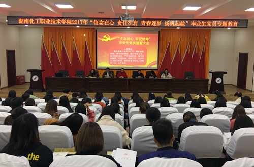 11月27日下午两点,由党委组织部、党校主办的湖南化工职业技术学院2017年“信念在心 责任在肩 青春逐梦 扬帆起航”毕业生党员专题教育在图书馆一楼2号报告厅举行。全校各二级学院175名毕业生党员参加了专题教育。
