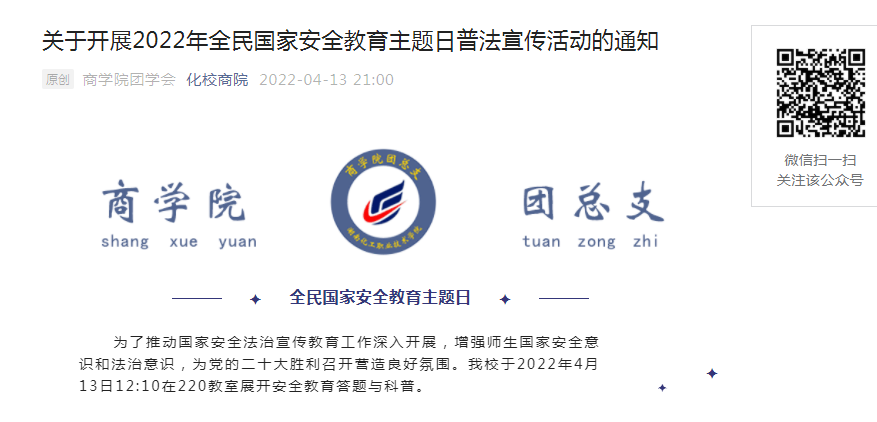 商学院团学会组织学生开展安全教育答题与科普活动,让同学们从政治安全、国土安全、军事安全、文化安全、科技安全等领域理解“国家安全”的内涵,增强学生的敌情意识、保密意识、防范意识、支持配合国家安全工作意识,进一步增强了学生的学习积极性,拓宽了学习范围,巩固了学习效果。