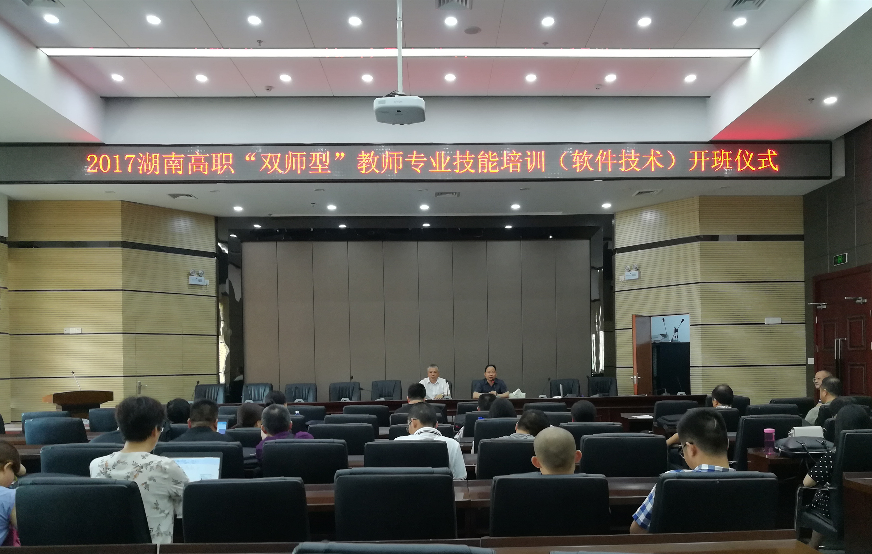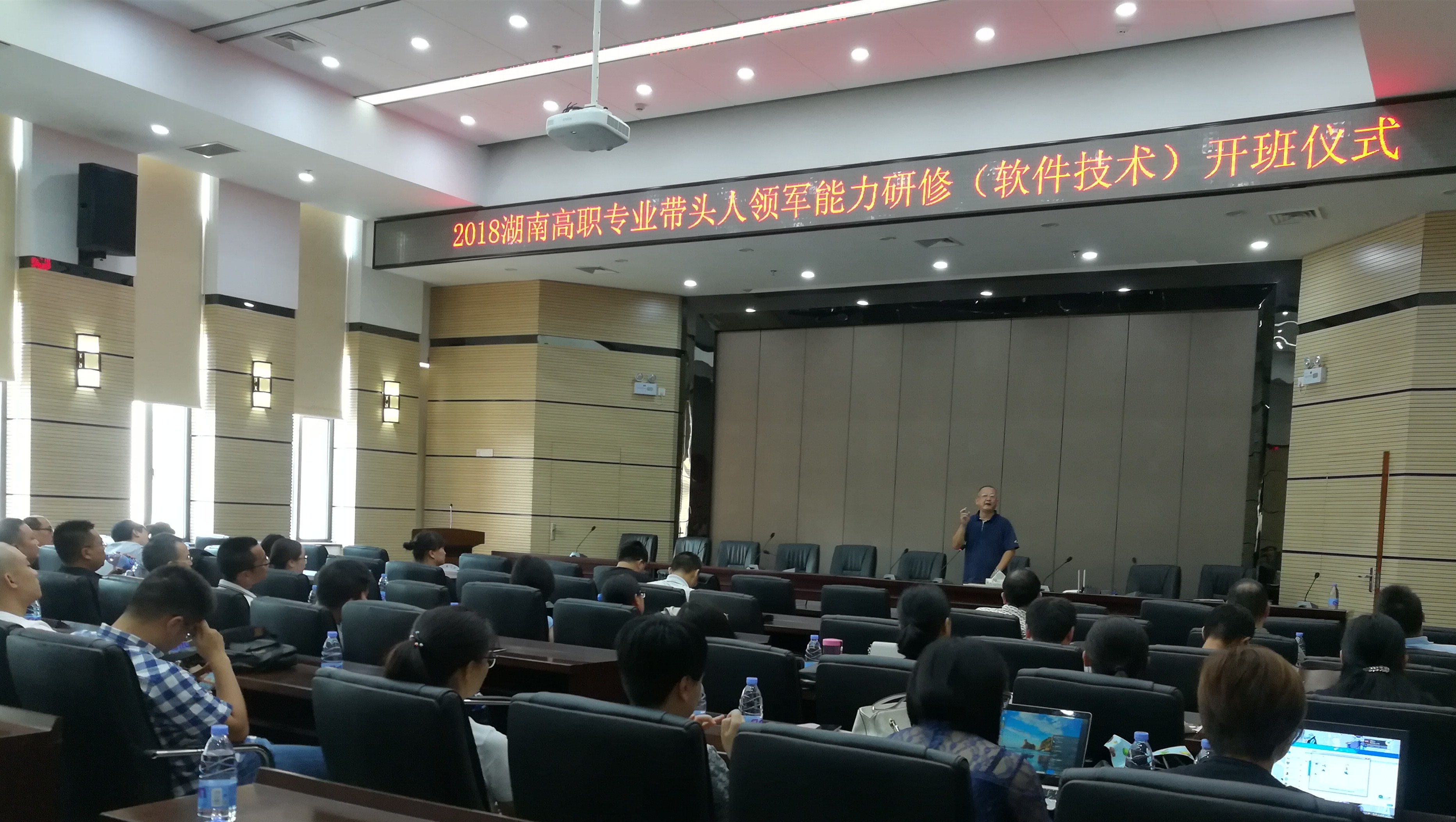 根据湘教职培办[2017]7号、湘教职培办[2017]5号文件,我校被成功遴选为2017年湖南省高职院?!八π汀苯淌ψㄒ导寄芄壹杜嘌祷兀ㄈ砑际酰?、2018年湖南省高职院校专业带头人领军能力国家级研修基地(软件技术)。7月11日,“双师型”教师专业技能培训、专业带头人领军能力研修这两个国家级培训项目同时开班,开班仪式在行政楼一楼会议室举行。校长王雄伟教授、副校长童孟良教授、自信学院院长欧阳广教授等出席了开班仪式,同时参加开班仪式的还有来自全省各高职院校的40名培训学员。