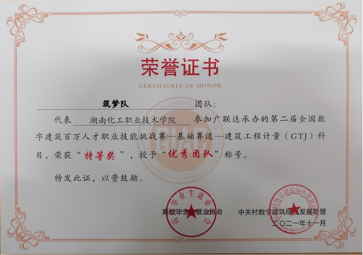 本次比赛由中关村数字建筑绿色发展联盟和高校毕业生就业协会主办,由广联达科技股份有限公司承办,旨在响应国务院“深化复合型技术技能人才培养培训模式改革,围绕产业需求,紧扣行业职业标准,将职业标准与教学标准融合打通,促进‘书证融通’”的职业教育改革精神。该比赛分建筑工程计量(GTJ)和BIM5D两个赛项,建筑工程计量(GTJ)赛项设团体特等奖1个、一等奖1个、二等奖3个,三等奖5个。在激烈的角逐中获胜,再次展示了化院学子的风采,彰显了我院职业教育内涵建设的新成就。