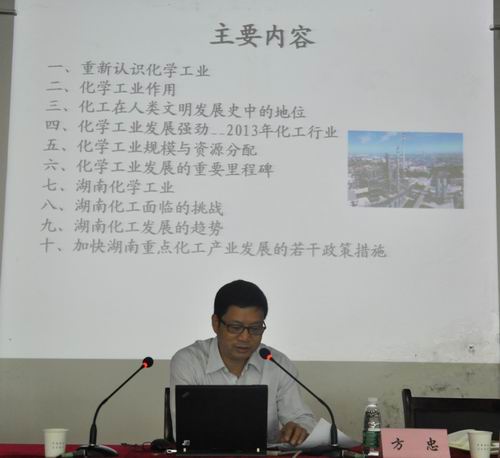 方忠在讲座中提出,要跳出湖南化工看化工,要站在经济发展、湖南发展的角度来看化工,用发展的眼光、挑战的眼光来重新认识化学工业,他主要从十个方面进行了阐述。谈到重新认识化学工业,他认为化工是强国产业、强省产业,也是朝阳产业。他引用联合国利马宣言中的话,指出化工是基础产业,同时也是支柱产业,是民生产业,与现代人的生活息息相关。化工既是知识密集型产业,也是资本密集型产业,还是资源和能源密集型产业,是新兴工业化与战略新兴产业发展的基石。在世界百强企业中,化工占了二分之一以上,美国真正创造财富和效益的产业中就包括化工产业。韩国、新加坡、台湾等都是以化工发展为跳板进入经济发达国家和区域行列的??梢运?,化工产业工人在国外几乎不会失业,永远属于朝阳产业。方忠同时也提到了化工行业的特点和作用,对国家GDP所做的贡献,他以育种薄膜、环?;ざ越ú牡闹С盼?,谈到新农业、新能源的建设与开发,谈到化工的“双刃剑”作用,以及它与社会发展各方面需要的密切关系,阐明了化工在国民经济中所占的重要地位和它的不可替代与持续发展性。他从青铜时代到高分子时代,再到硅材料与IT时代入题,谈到改变21世纪的材料石墨烯时代的来临,列举了化工在人类文明发展史上的地位。从2013年我国化工行业的状况,谈到化学工业发展的强劲动力,谈到化学工业规模与经济分配的关系,以及化学工业发展的重要里程碑,详细分析了湖南化学工业的发展与挑战,以及当前发展的重大机遇,分析了湖南化工的发展趋势,谈到加快湖南重点化工产业发展的若干政策措施,其中就有积极引导本省化工类高职院?;⒒釉诮ㄉ枭拿骱吐躺ぶ械淖饔?。