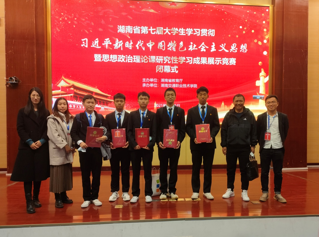 12月5日,湖南省第七届大学生学习贯彻习近平新时代中国特色社会主义思想暨思想政治理论课研究性学习成果展示竞赛圆满落幕。我校马克思主义学院王炎平、龙显辉老师指导的由化学工程化工专业20111、20112班学生奉贻雄、张磊、马文斌、张家友、曾嵘进组成的研究性学习小组以《全面依法治国前景下株洲职教城高职院校大学生法治素养的提升研究》为题进行现场展示,获高职高专组二等奖,充分展现了学校思政课程育人成效。