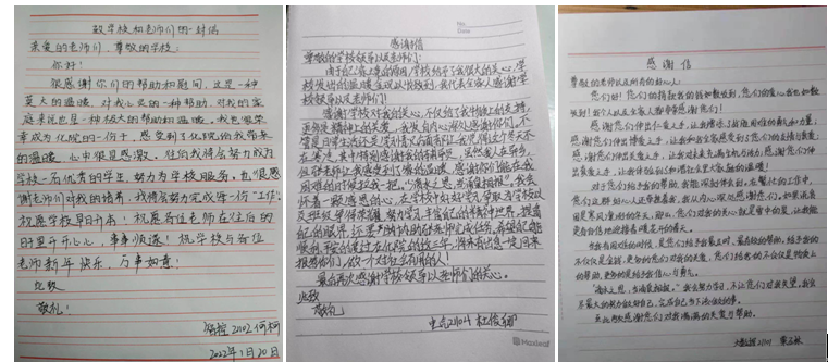 电气专业21级学生杜同学在信中说道:“感谢学校对我的关心,不仅是物资上的支持,更多是精神上的关爱,我发自内心地感谢!不管是日常生活还是学习方面,都让我觉得这个冬天不再寒冷。特别感谢我的辅导员,虽然我人在异乡,但感受到了家的温暖。‘滴水之恩,当涌泉相报’,我会怀着一颗感恩的心,好好学习,丰富自己的精神世界,为学校和班级争得荣誉!”