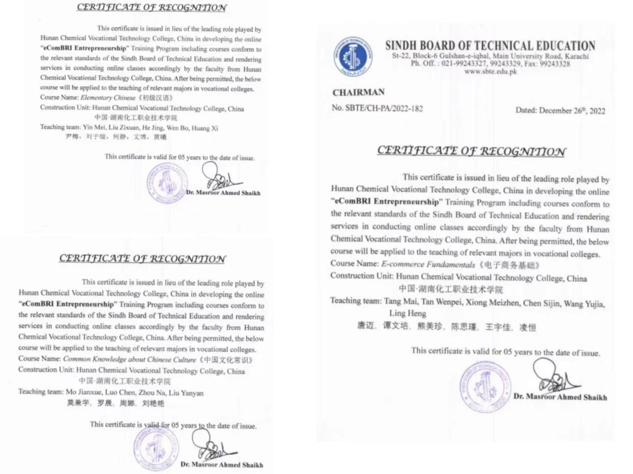 12月26日,以莫兼学为组长的中文教学团队和以谭文培为组长的商务教学团队共同开发的《初级汉语》、《中国文化常识》以及《电子商务基础》课程标准成功通过巴基斯坦信德省职业教育委员会认证,这标志着我校专业课程进入了该国的职业教育课程体系,实现了职业教育标准输出。