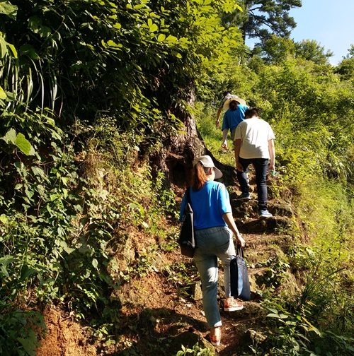 7月26日,化工职院“情牵脱贫攻坚”工作组到达扶贫帮困点——郴州市宜章县所辖区域贫困村正式开展工作的第二天。山间清晨的丝丝凉风拂去了化院人昨日的疲惫,趁着炙热的太阳还在云间嬉戏,天才蒙蒙亮,化院人拿起文件袋、提起水壶、戴上草帽,再次出发了。今天他们要到离住处较远的农户家进行调研走访,山路崎岖,没有交通工具,只得徒步前行。