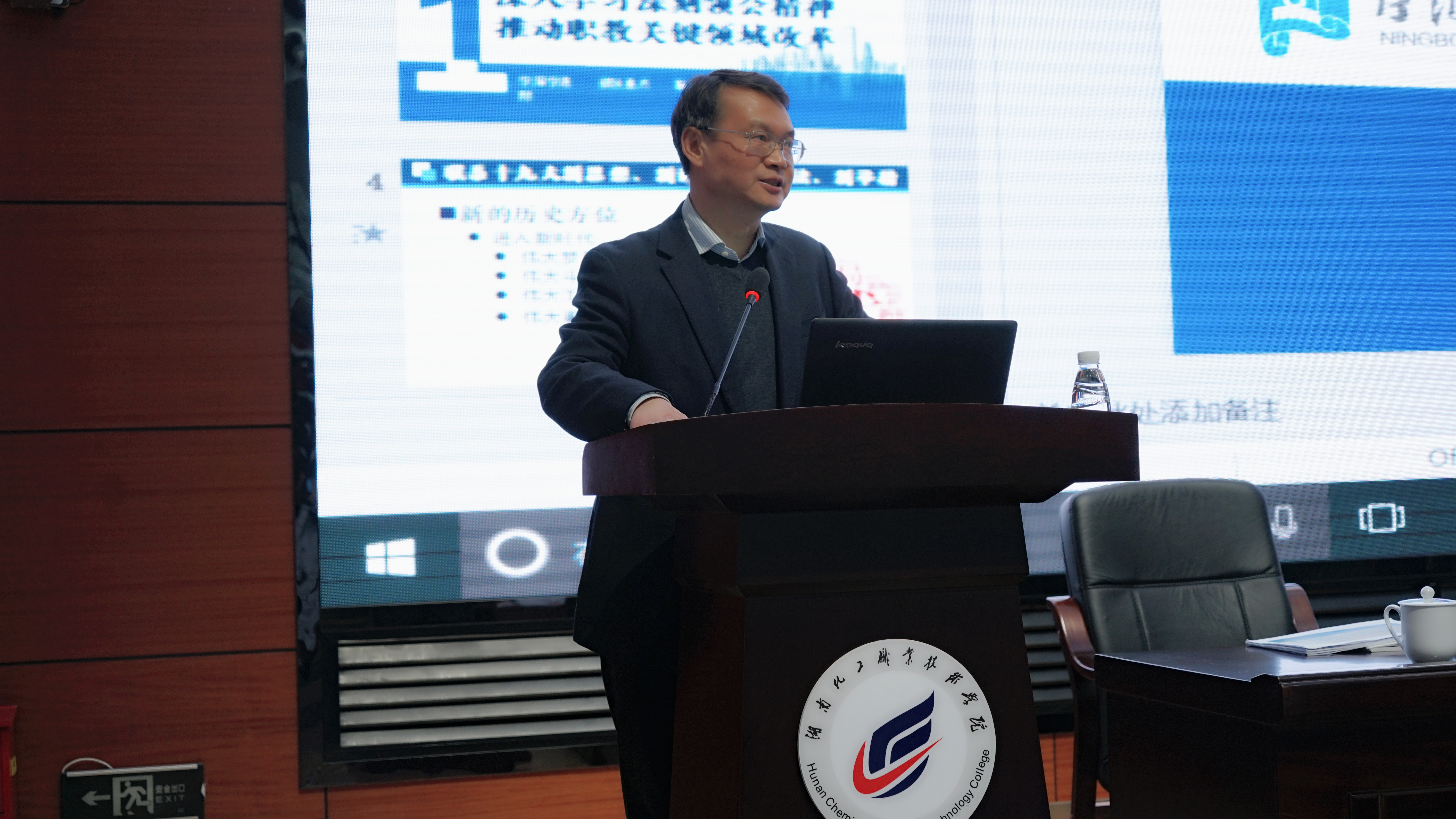 中国职业技术教育学会副会长、学会城市职业教育专业委员会主任、宁波市教育局原局长沈剑光宣布会议开幕,并作题为“深入贯彻十九大精神、积极推进体系、机制创新”报告