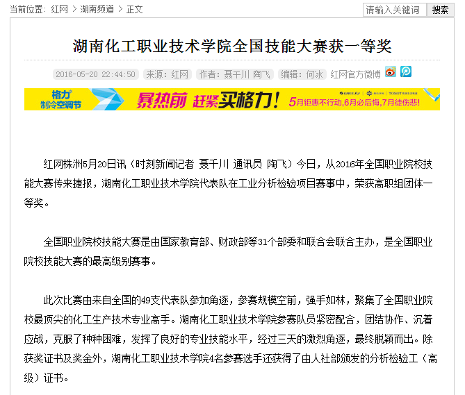 红网:湖南化工职业技术学院全国技能大赛获一等奖