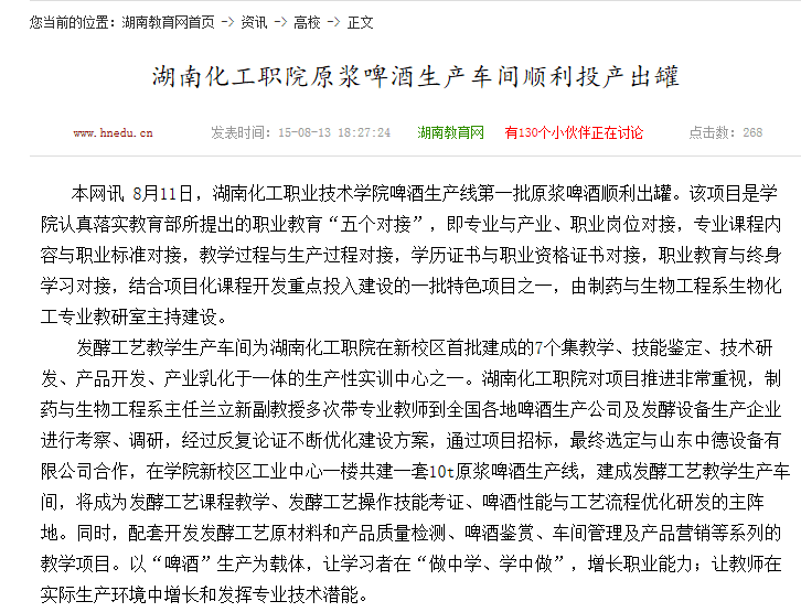 湖南教育网:湖南化工职院原浆啤酒生产车间顺利投产出罐
